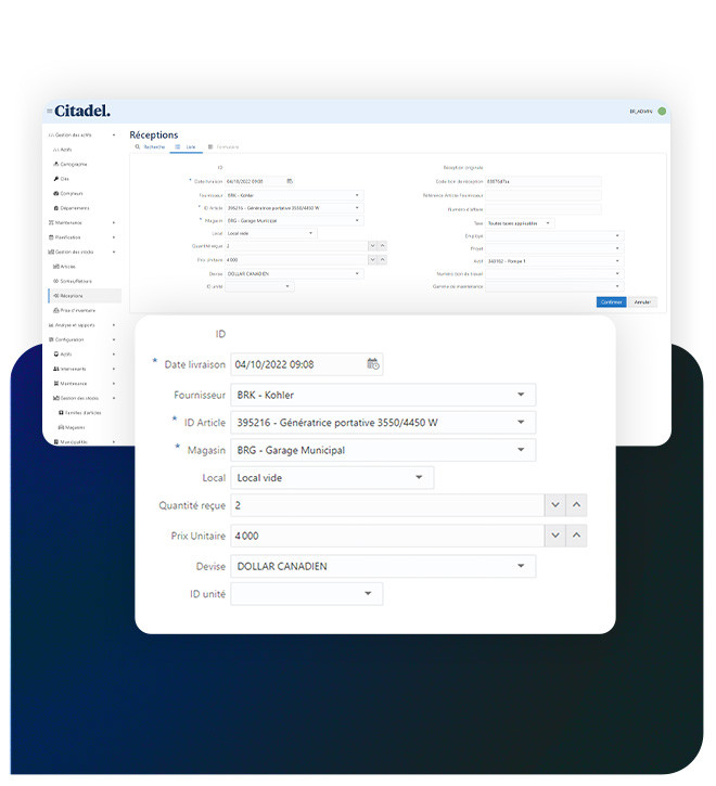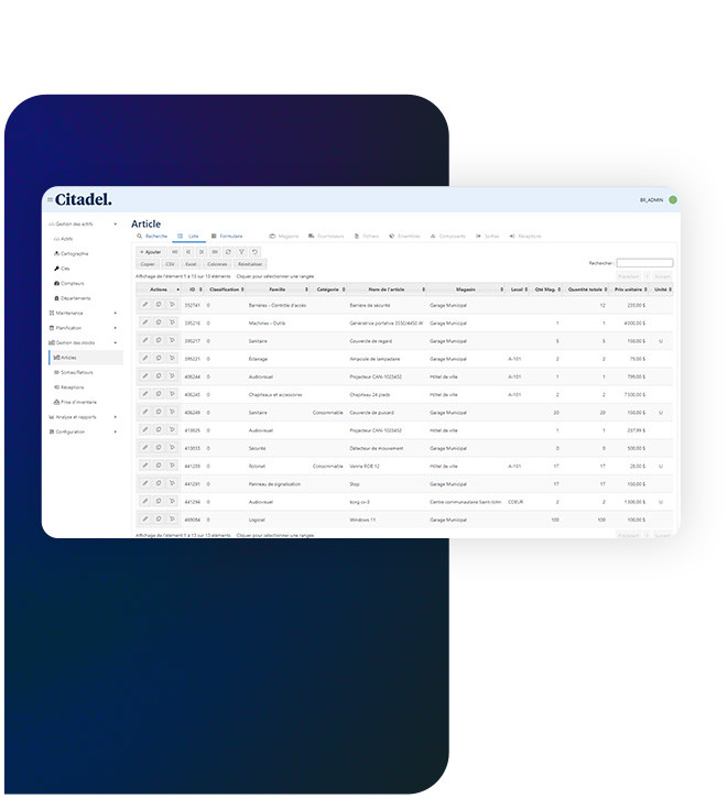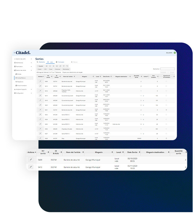 Bien plus qu’une simple base de données, Citadel vous permet de gérer vos inventaires de pièces d’équipement et d’articles variés avec une étonnante simplicité. Augmentez votre efficacité et économisez temps et argent, en ayant toujours sous la main la pièce qu’il vous faut pour vos réparations et vos maintenances.